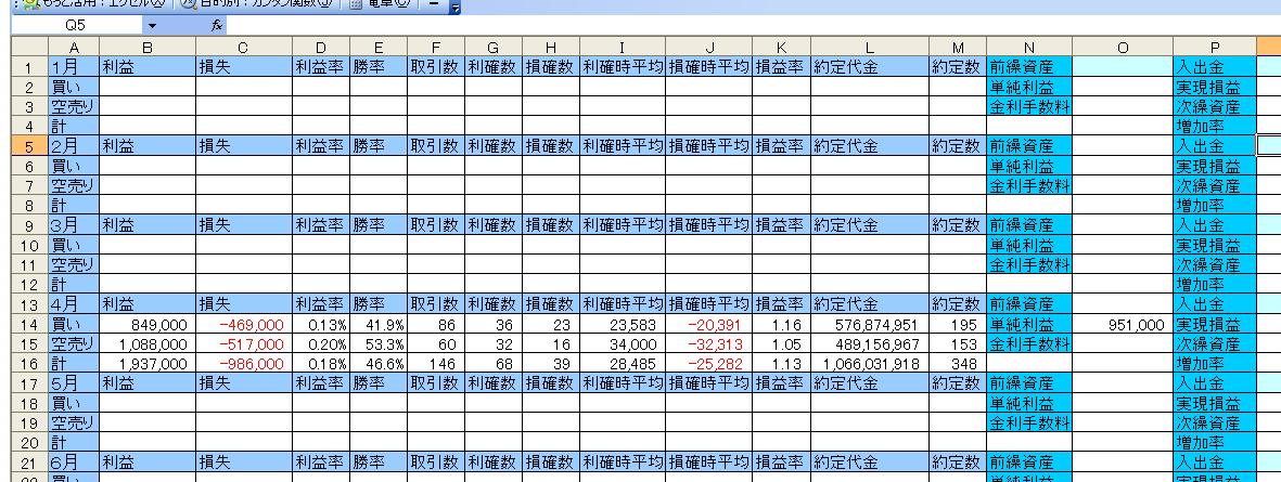 1月 +453,899円 15勝4敗 2月 +351,034円 13勝6敗 3月 +930,372円 17勝4敗 4月 +1,120,151円 17勝4敗 5月 +768,802円 5/17