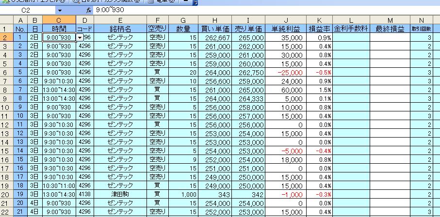 (最近になって徐々に「複利」の力を感じてきた・・・!上にも下にもね^^;w) 朝、「買いかなぁ~」ってことで買いを狙っていて301っていうかなり安値で入れた。30株か15株か迷ったのですが結局15株。てか、そんな迷っている時間は無く急上昇。30株いっとけばよかったです;w; 最近の雰囲気からして今日はとことん上か?!と思ったので最初の15株のうち10株は314まで引っ張りました。結局315を最高値に切り替えしてきたので一番良いところで売れましたね(・∀・;)ヤタ。 その後買いでマイナス3万くらったあとはゼンテック動かないと思いIPOへ→ゼンテックさげてるぅぅぅううぅ!!!→凄い売り煽りきたーーー!!!→便乗(+3万)!!!→ドテン買いじゃーーー!!!→爆死。 このままいけば初の月間実現損益100万overなのですが、ひとつ気がかりなことが・・・・ 頼む(・∀・;)バクシカンベン!!! はいはい、、、前場のうちに手仕舞いしようとしていた買い15株、あまりに集中しすぎて気づいたら11時越えてたんですが、見事に爆死! 結局100万きってしまったし; 6勝4敗1分け 合計 +136,000円