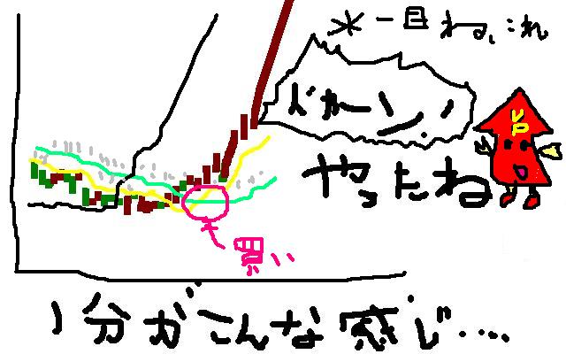 後場 TS)楽天 +1200 +4500 2戦2勝 合計+5700 前場は大学のためトレード無しです。 昨日は「テポンドでアメリカDOWN(根拠なし)→日本も織り込み済みといいつつ 個人投資家はアメリカDOWNでびびって売り→GDスタート」という単純な予想を たてていたんですが当たってうれしいです。 ショートしてないんで全く意味ないですが・・・w 帰ってきてチャートを見ると、昨日上場したライフなんたらがかなりいい感じでしたね。 なんかライフ~だけに資金が集まってるのかなと思い、ダブルでポン(アドリブ投資方法)で はいろうと監視・・・ 「お、転落してから徐々にモリモリしてきたな・・・」 「むむ、そろそろ転換線が 突き抜けるぞ・・・ なんか買いも増えてきた 気がするし~~~」 (「ん~まだ早いかなぁ・・・でもこの値段からして次の1分足がついたら 転換線突き抜けるしなぁ・・・だったらここで買っておこうか」) 「よしっ、買うぞ!、、、(もじもじ)」 そして・・・ ドカーン!!爆上げ!! 「だああぁぁ~、まだ買ってねぇよ!ヽ(*`Д´)ノゴルァ」 もじもじしなきゃよかった _/>,,,,○コロコロ ということでもじもじ厳禁。 そもそも安心してから買うんじゃ駄目なんですよね、たぶん^^; 安心してから買うような人に売りつけるほうにならねば _/>,,,,○コロコロ ![]() 実録!!これがアドリブ投資法の全てだ!!(2006/7/01)