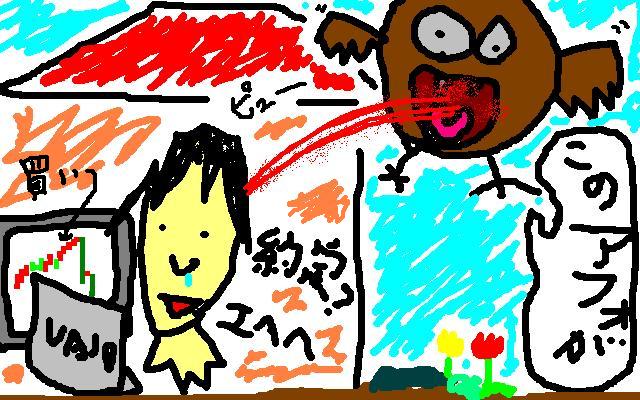 ってことは、こんな感じですかね↓(クリックで拡大!) 前場 S)HUMAN - 7000 L)ファンコミ - 9000 S)ファンコミ - 6000 L)ファンコミ - 7000 もう漫画ですw「買い」と思ったら売り、「売り」と思ったら買えば億万長者になれるかもしれません!! _/>,,,,○コロコロ 後場 S)ZEN -2000 S)楽天 +5000 +2500 +2000 S)HUMAN - 600 9戦3勝 実現損益 -22100リットル もうダダ漏れです^^; ちょっと、まじめに考えないとやばいですね ![]() ![]() 溶け出してますから・・・ ![]() 今日の反省 前場のHUMANは、なんか急上昇したから上昇ストップしたところでショート、こんな適当な売買では負けるのはあたり前田のクラッカーです。 ポジション建てたときは保合いになったんですが、強烈な成り買いでそこからいっきに上に突き抜けました。TT ファンコミは5分足(普段は1分足)で建てたんですが、5分足で判断したなら損切りも利確もその時間軸で判断しなきゃいけないと思いました。 ちゃんと我慢できてれば利食いできてたっぽいです。 人気blogランキングへ←ランキングもダダ漏れ ![]() 株ブログで安定して利益をだしている方々はすごいですね。きっとアドリブの100倍は努力しているんでしょう^^;がんばろ・・・・ PR 大分弱っているようです![]() こんばんは、今日は(も)マイナスです、マイナスだから 更新おそいですw見に来てくれてた方ごめんなさいTT 前場 Sファンコミ -3000 初空売りはマイナス・・・・ど、どんまい。 後場 Sファンコミ +4000 Sファンコミ -8000 Sファンコミ +2000 Sファンコミ +5000 Sファンコミ +2000 L佐藤渡辺 -5000 L佐藤渡辺 -7000 7戦4勝 実現損益-10000 今日の反省 Sがショート、Lがロングです。今日上げまくりのファンコミで空売りしてる オレって・・・ど、どんまい。一応ぷらすだしw 佐藤さんと渡辺さんにはやられてしまった^^; 両方とも下げスピード激しくてあっという間にこんな損失に・・・・ てか、あの佐藤渡辺上昇トレンドで損したのって、アドリブだけでは ![]() ![]() てか、通算実現損益が-20万突破しました!! イヤッホーーーー!!,,;⊂⊃;,、 (・∀・∩)トッパトッパ 【( ⊃ #) し'し' ・・・・・ || ∧||∧ ( / ⌒ヽ || | ∪ 亅| | | | ∪∪ 人気blogランキングへ←イヤッホーー・・・TT ![]() って今見たら信用口座開設完了通知キタ!